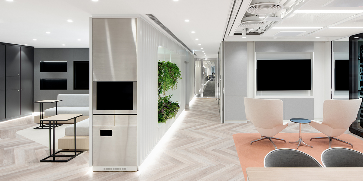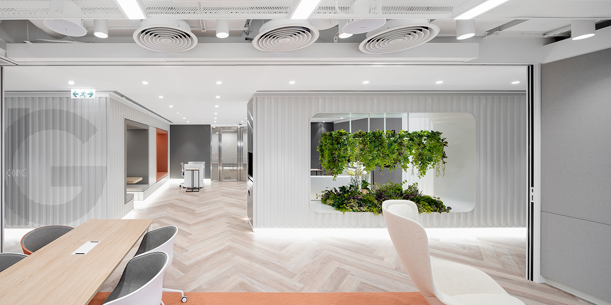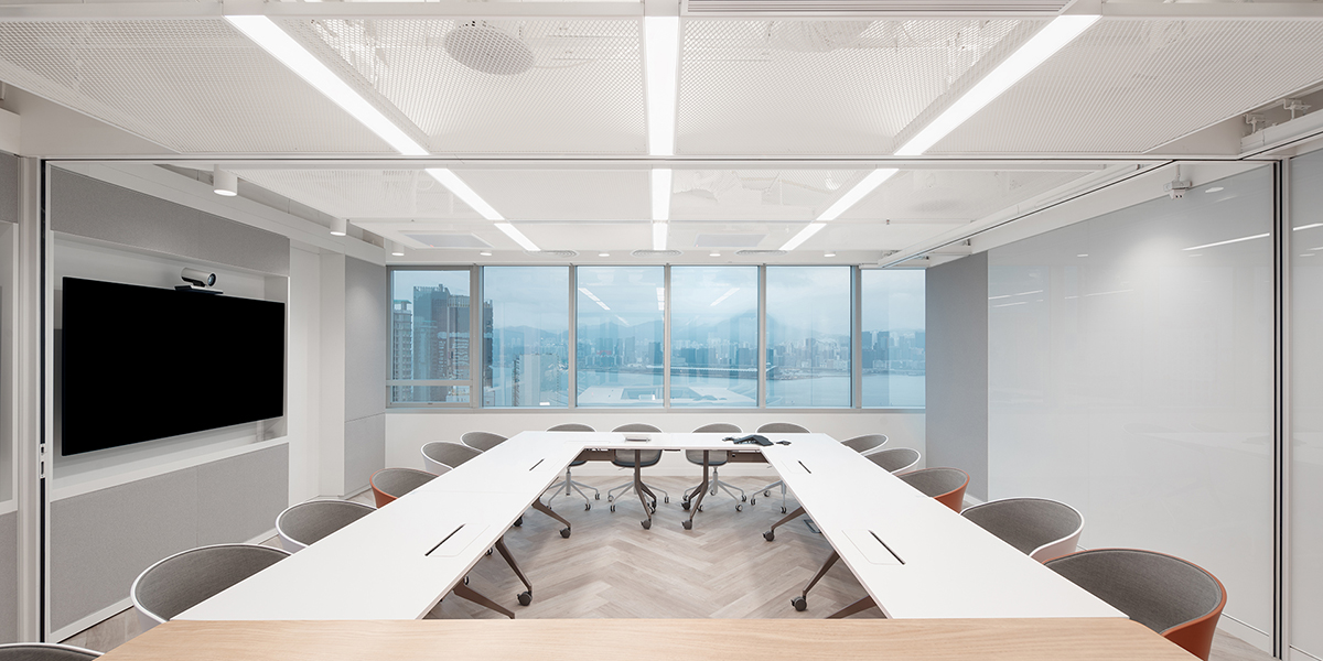 楼层重新配置为拥有灵活会议室的公共区域,访客进入空间的第一印象是一个明亮的休闲接待区,品牌logo的周围环绕悬挂着清新的绿植,提供了一个直接工作空间,同时也拥有星巴克的悠闲氛围。接待区的后方是一个独立的会议区,透明玻璃隔断营造通透开放的空间质感。从封闭会议室的窗户向外眺望,可以感受到整个九龙湾和旧机场跑道的壮丽景色。 Beyond and through the enclosed meeting room windows are stunning views of Kowloon Bay and the old airport runway.