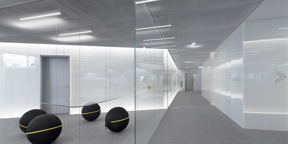 客户的期望是要打造以生活方式为灵感的健身训练场所,在专注训练的同时倾听DJ的旋律挑拨,享受当代艺术的视觉感受。总面积850㎡的空间需要承载各类功能,较低的层高为设计增添了更多挑战。钢炮灰的金属网与白色聚氨酯板奠定了设计的两大主导元素,与通高玻璃,波龙(BOLON)地毯,布料软包等材质搭配使用,交相辉映,相辅相成。从电梯厅延伸到健身空间的走廊纯粹而洁白,聚氨酯板搭建的白色通高墙面通过隐藏灯带整面打亮,前方透明的玻璃板赋予空间清澈及宁静之感,同时为艺术作品的展示提供了绝佳环境。定制的LED大屏幕设置在聚氨酯板的后方,为空间的日常运营提供了亮点,也为特殊活动打造了视觉焦点。
