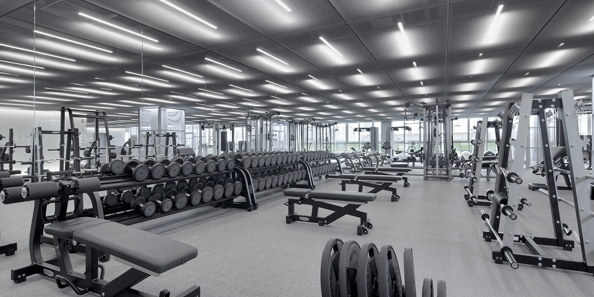 The client’s vision was for a lifestyle inspired gym, where you can do a work out whilst listening to the DJ spin some tunes and admire contemporary art. For an 850 square meter space there were a lot of functions to accommodate, which was made more challenging due to the low ceiling height. Gun powder grey metal and white polycarbonate were the two predominant materials, with glass, Bolon carpet and soft fabrics as complementing accents. The approach leading from the elevator to the gym is pure and white. Walls of white polycarbonate are illuminated from the floors and ceiling by hidden lights, with sheets of clear glass lining the front, giving a clean, calm feel to the space. This environment is also ideal for displaying art. A custom made movie screen composed of an LED screen behind a layer of polycarbonate created a central focal point for everyday use as well as during events.