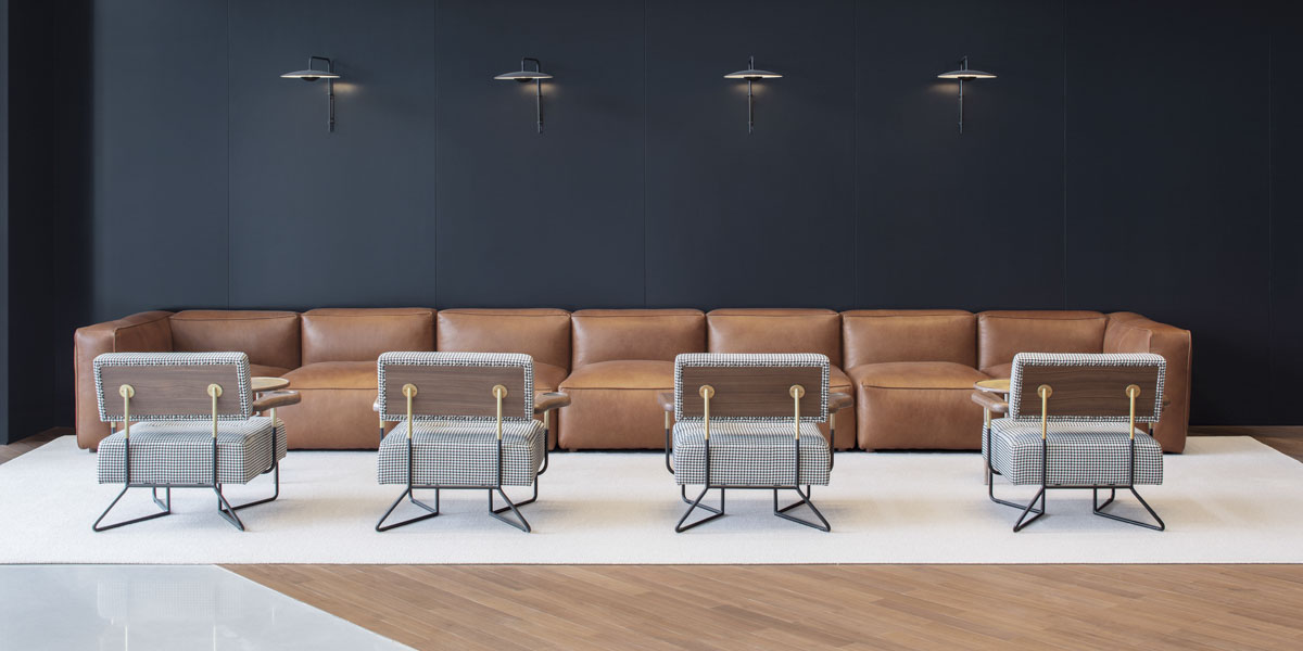 采用激光雕刻的穿花金属网格和条状错拼接人造石等年轻税利元素的同时,我们还保留了温暖的深木色、极度舒适的等候区沙发座椅,以及和吧台合二为一的超长前台,隐约点明了曾经的华润饭店的非凡历史。