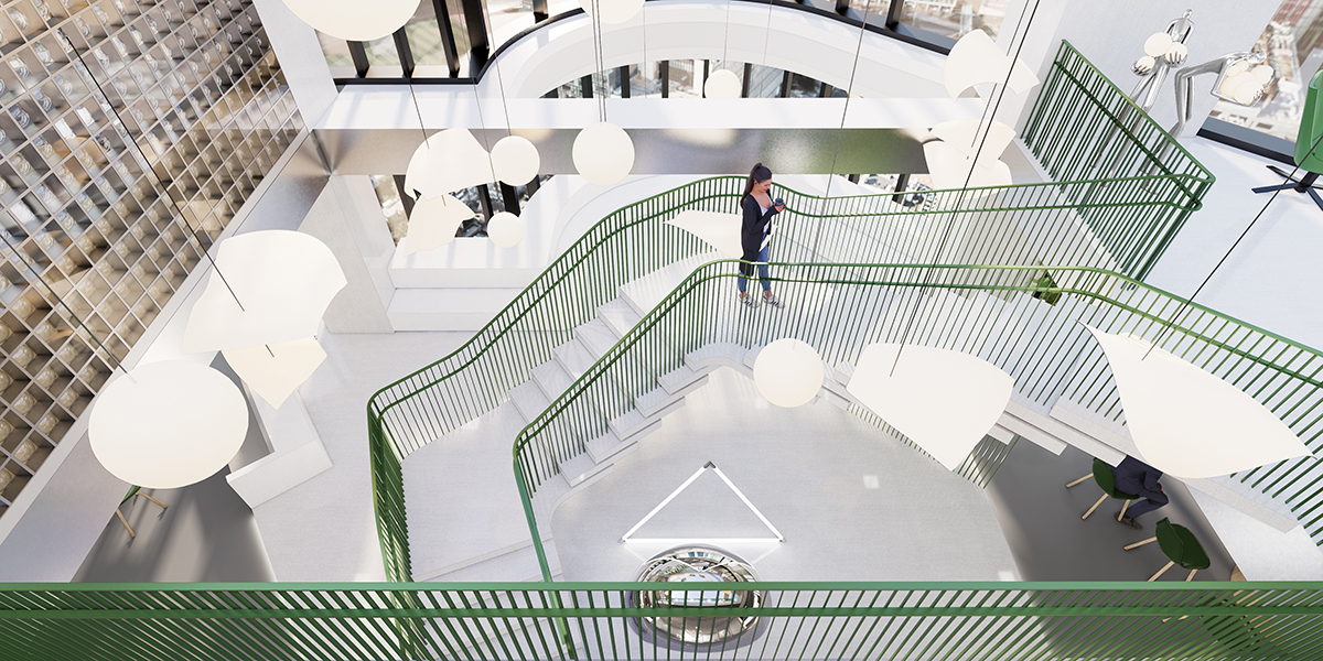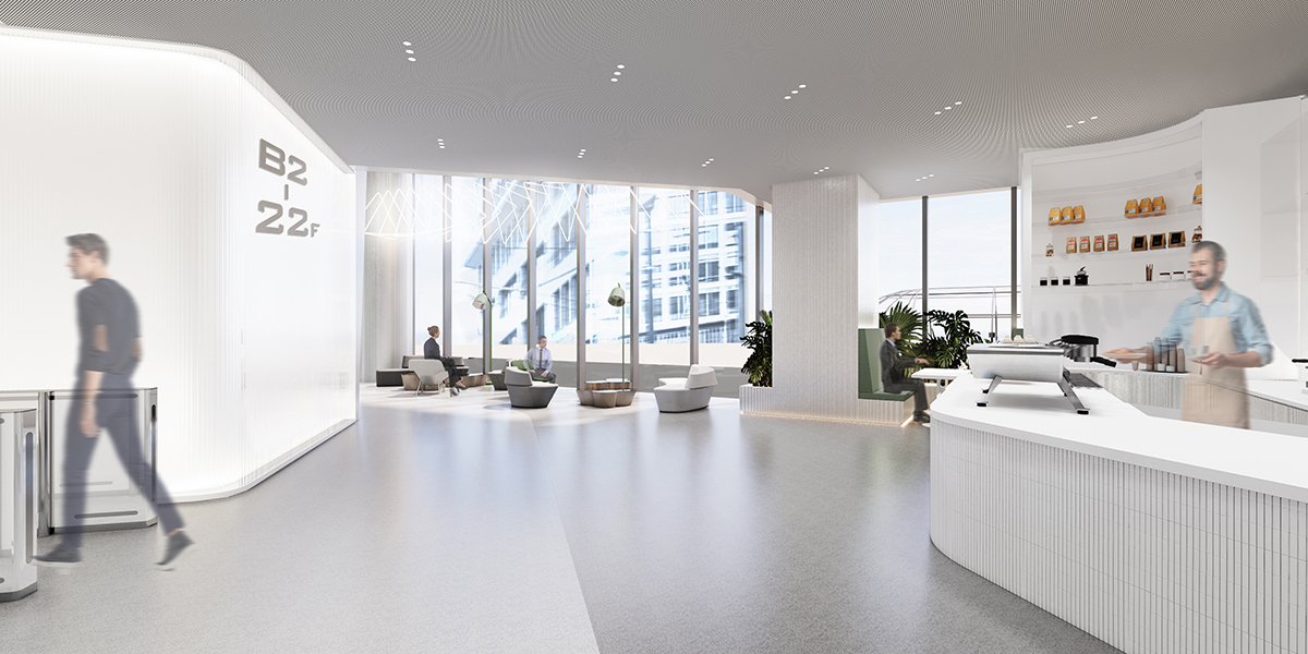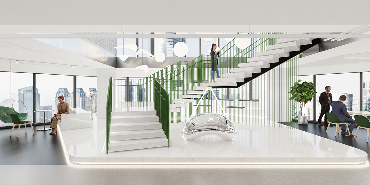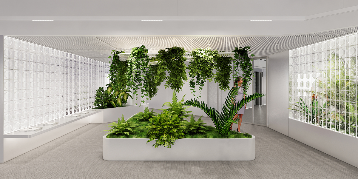 设计通过以白色为基调的空间色彩,结合自然绿植以及不同层次的绿色材质,营造出一种清新而现代的氛围。这些元素共同塑造了一个开放而友好的入口环境,为总部的迎宾空间带来更加现代与舒适的体验。
