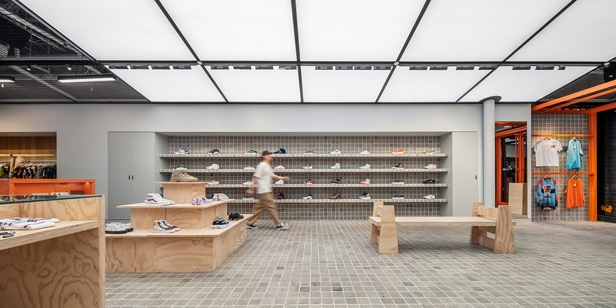 Soulgoods灵魂虎品牌下的产品都具有十分独特的属性——每件产品都拥有自己的灵魂。在探索品牌空间形象的过程中,anySCALE将品牌核心价值中匠心与质感的部分反映在空间视觉形象里。店铺的入口和前场区保持尽可能的开放,欧松板材制成的展示台可以根据需求灵活移动,地面采用小块的方形石材整体铺装,打造街头感。空间的主要展示墙面采用嵌入式的陈列方式,每双球鞋都归置得井井有条,供消费者挑选。空间中不同墙面上的涂鸦,以及类似涂鸦风格的卡通图案,加深了整个店铺的街头气息。之前成都店的中式斜坡屋顶木格栅的设计,在北京店铺改为了更为简洁的灯膜,RGB的设置提供了更多灯光变幻的可能性,无论是Party还是新品发售,整片天花灯膜的颜色可以根据不同场景的使用需求任意切换。