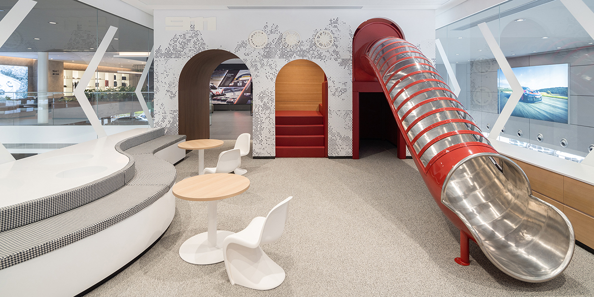 二层空间主要是客户接待区以及休闲餐饮区。由深木和暖光营造的舒适咖啡吧,提供保时捷专属特饮。然后是配置了休闲家具和灵动绿植的公共活动区。可以满足各个层面客户的需求,年幼的孩童可以在设有大滑梯的活动室嬉戏玩耍;年长的儿童和成人则可以到驾驶模拟器中飞驰一番;大人可以选择按摩器械来舒缓减压,又可以在图书馆内享受闲适的阅读时光。如此功能多样且别具一格的空间配置,为客户在等候车辆交付时提供放松身心的理想空间,同时,也为潜在客户及其家人,在参观完展厅后提供放松休憩的场所。
