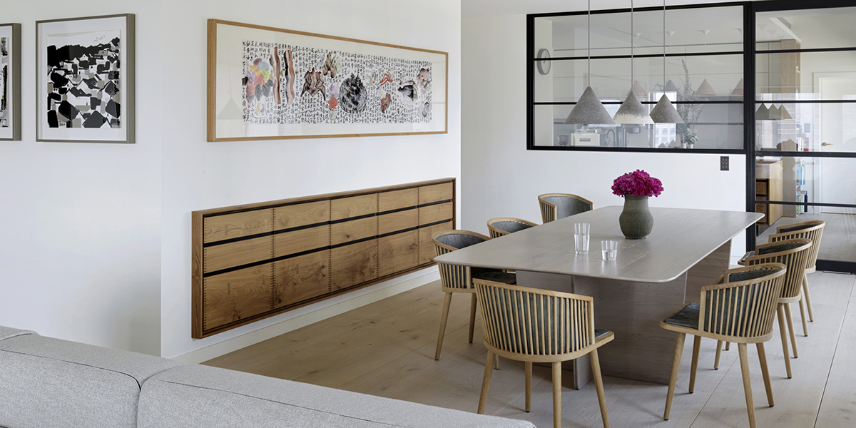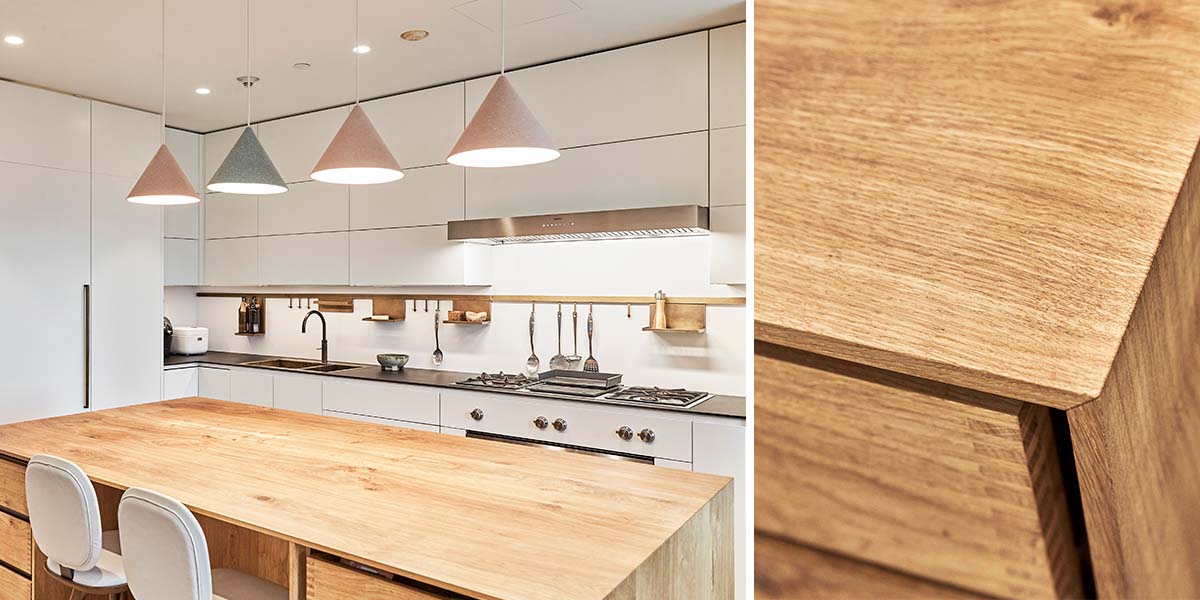 在这个350平米的空间内,anySCALE将空间的布局整体划分为三个层次,即外圈嵌入式飘窗的温馨临窗观景区,中央开放的主功能空间,以及更为私密的内部空间,动线规划上清晰流畅、互动性强。在这个改造过程中,anySCALE亦与几家欧洲品牌携手合作,包括来自丹麦的Dinesen, 负责将来自北欧的纵向切割的整树,在保持其原有高度和宽度的情况下,成片切割制成独特的木地板,将原始森林的天然质朴带入室内,打造了独一无二的地面材质。