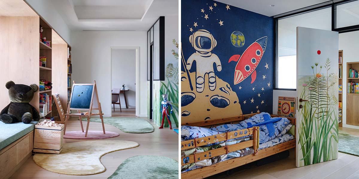 朝向东面的空间为儿童区,三间独立封闭的卧室沿着中央空间顺次排列,与偌大的共享浴室和开放的游乐区相连,在保证了大龄儿童所需的私密空间外,也鼓励沟通与互动,帮助亲子及手足之间健康关系的树立。此外,儿童区旁边还设有静谧的书房,为成年人提供了一个更为私密的环境,用来招待访客、或专心工作,不受外界的打扰。