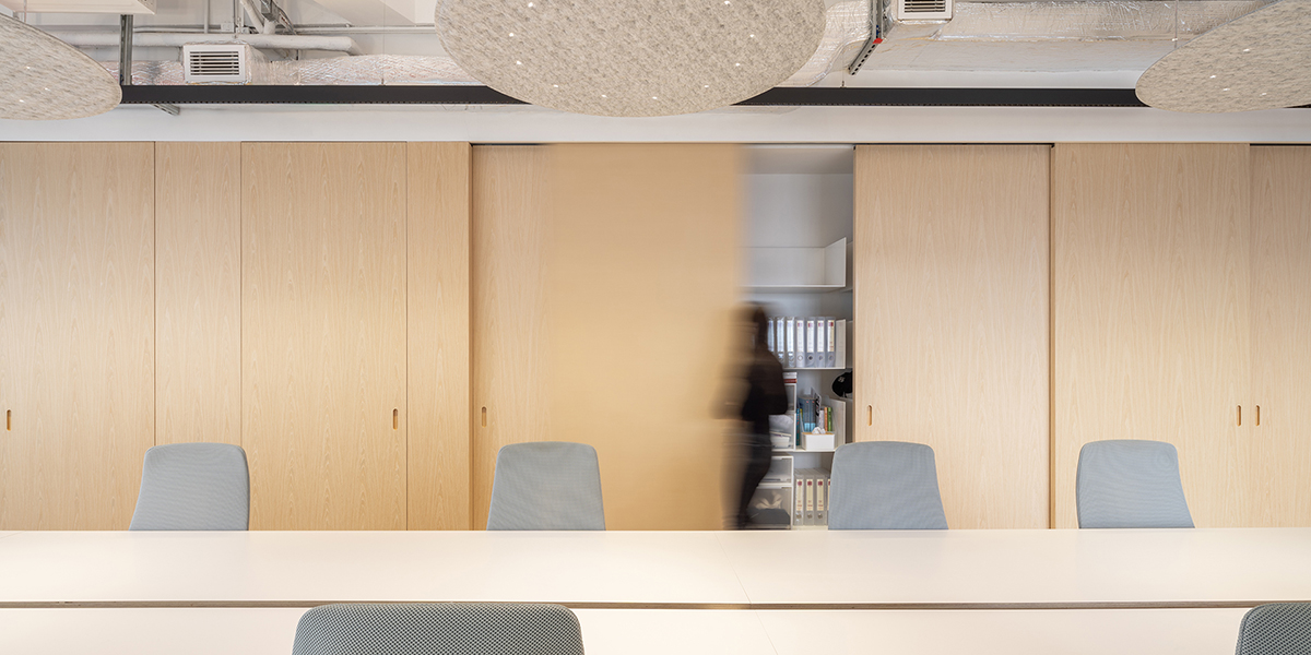 除了收获LEED金级认证和WELL铂金认证之外,森唯办公室的空间设计也完全满足最高绿色建筑标准,多功能区域的展示,将品牌自身拥有的优质工艺,与节能环保理念相互兼容,呈现在这个时尚的空间里面。天花上的毛毡吸音板、吸顶照明系统、绿色环保科技以及其它嵌入的设计手法,从多维度实现了在视觉、温度、声学等方面的舒适感,打造出优雅和谐的空间。位于主展厅的中央摆放着一张内置抽屉的定制桌子,用于展示各色建筑材料,侧面整排嵌入式通高储藏柜,设置了紧凑有序的储物系统。开放办公区的功能包括用于休闲的等候区,以及模块化电话间,功能布置上,将材料陈列展厅与员工的工位进行了合理的分隔。可移动木格栅门背后暗嵌了冰箱、红酒冷却器及更多储物空间,令整个空间在外观上维持干净整洁。
