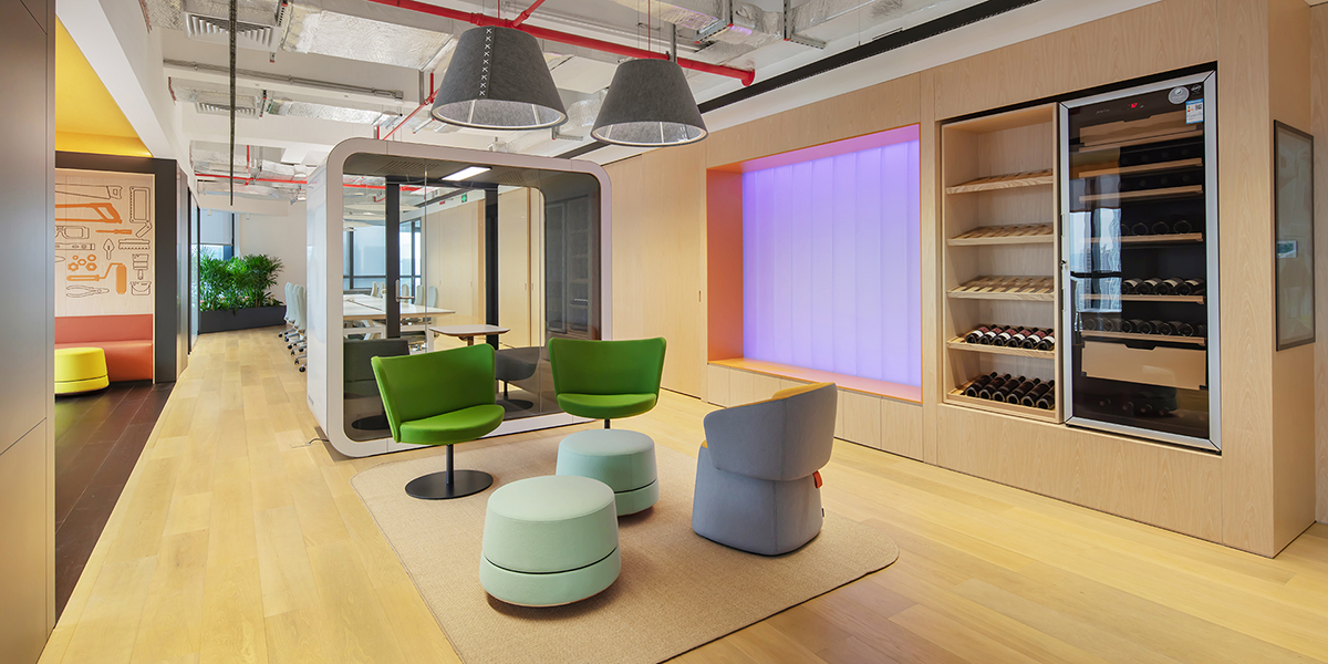 沿着窗边设置了一整排卡座,沿着幕墙的结构梁排布,形成了嵌入式的家具模组,并延展出茶水区的功能。平面设计团队精心打造的艺术雕刻墙面,以及天花上的彩色毛毡,为这个空间注入了活力与能量,也非常符合空间的使用功能及氛围营造,或者节日活动的欢聚空间,或者安静的讨论区和项目展示区。除此之外的其它功能区还包括,一间拥有双层可调节玻璃隔断的VIP办公室,兼具了私密会议的功能、一间拥有最前沿的技术设备的大会议室、打印室及隐藏在背后的母婴室。地面上法式风格的地板采用不同图案的拼接排布,天花上造型大胆且色调自然的吸音板贯穿整个办公空间,在视觉上起到了不同区域之间的划分。